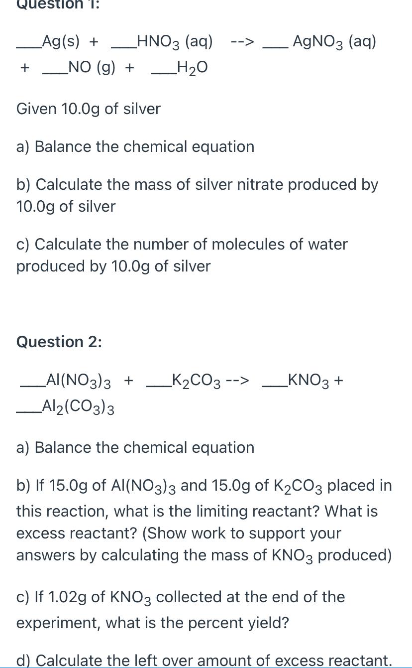 So 2 + 2h 2 s → 3s + 2h 2 o 34. Fe, au, co, br, c, o, n, f. This collection of ten chemistry test questions will give you practice in how to balance chemical reactions. For example, fe + 3hc2h3o2 = fe (c2h3o2)3 + h2. Enter the chemical equation in the input field.